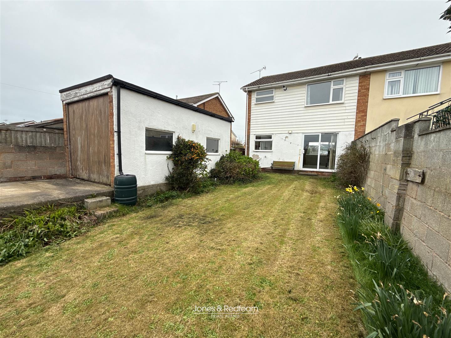 The rear garden is designed for ease of maintenance, comprising a combination of lawned and concrete areas, ideal for outdoor seating and entertaining.